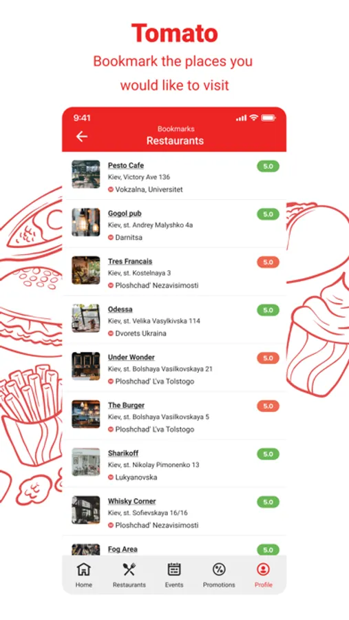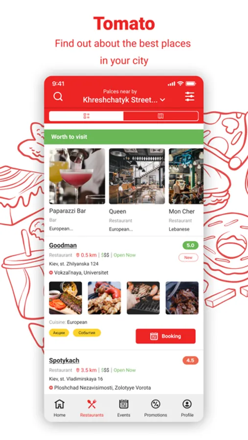 Tomato is the best guide to restaurants, cafes and bars in Ukraine. We can help you find information about restaurants of Kyiv, Odessa, Lviv and many other cities. Look at the menu and pictures of a restaurant; read reviews and check ratings of other users; share your own opinion and pictures. Now you can always find out where the best pizza in Kiev is, where to watch football with a glass of beer in Odessa and savour the most aromatic cup of coffee in Lviv. We’ll show you if there’s anything worth seeing happening tonight. When you’ve made your choice you can book a table without leaving the app. In addition, for your active participation you get points, which can then be exchanged for discounts and various complimentary treats.