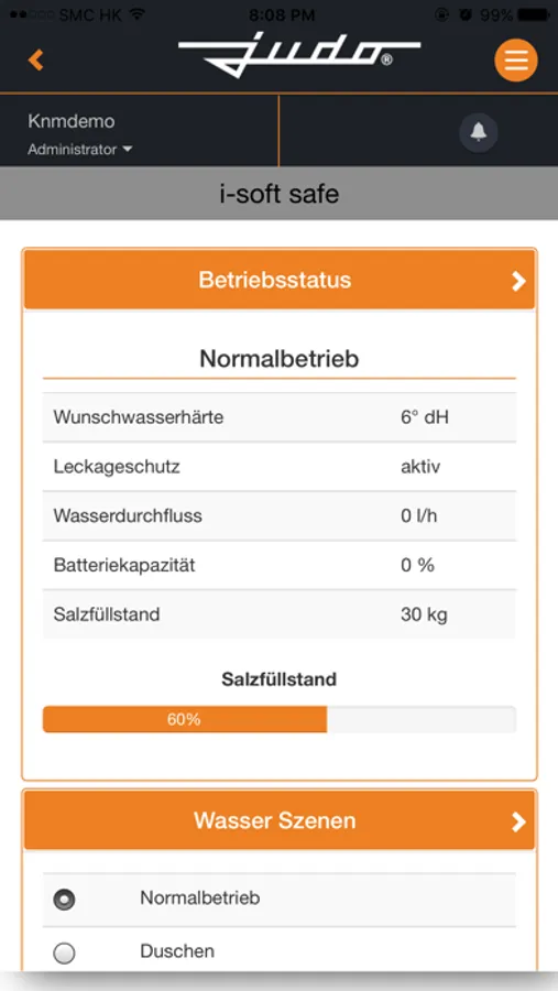 Die JUDO JU-Control App bietet Ihnen die Möglichkeit, Ihre netzwerkfähigen Geräte von JUDO fernzusteuern und zu überwachen. Sie können sich jederzeit über alle wichtigen Betriebszustände informieren und relevante Daten abrufen. Ganz einfach, intuitiv und komfortabel. So sind Sie zum Beispiel immer im Bilde, wann bei Ihrer Enthärtungsanlage Salz nachgefüllt werden muss.