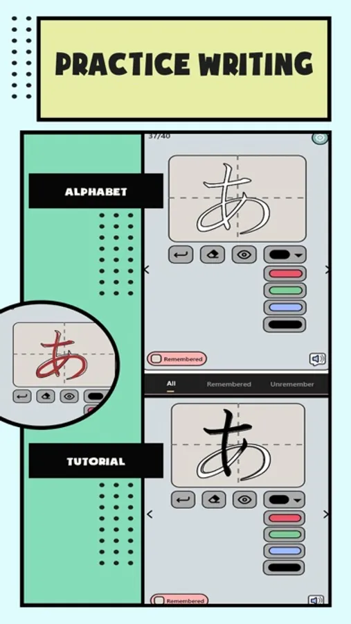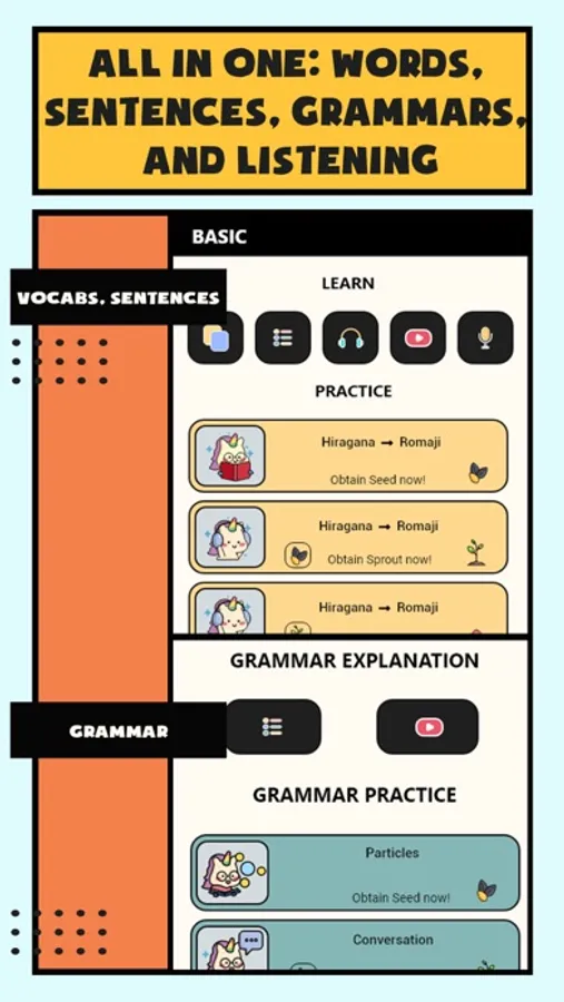 ・Basic knowledge and various practice questions available (Hiragana, Katakana, Kanji, words, sentences, grammars, writing, typing, listening, speaking)