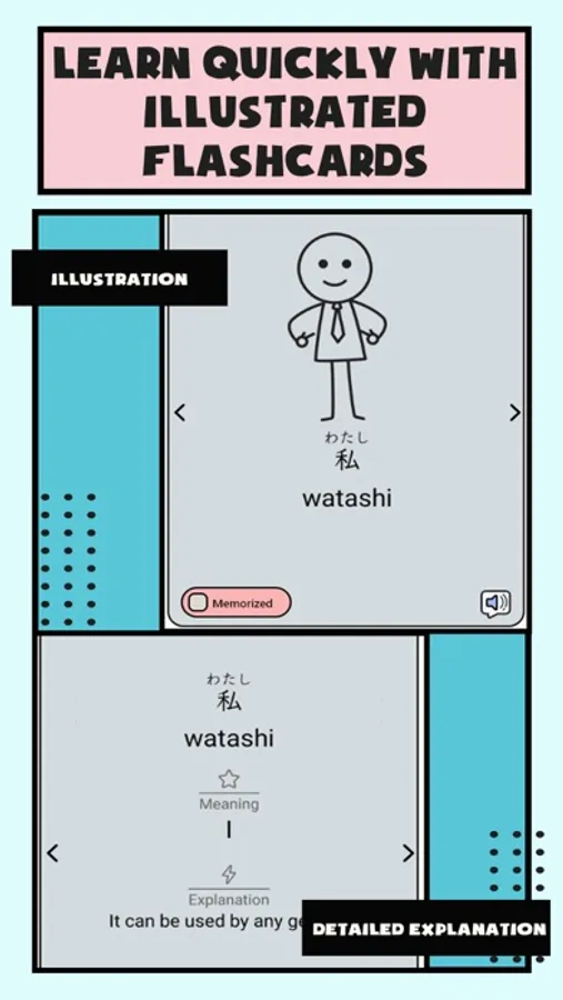 Flashcards of words and sentences are available with illustrations and native Japanese pronunciations useful for practicing listening and speaking.