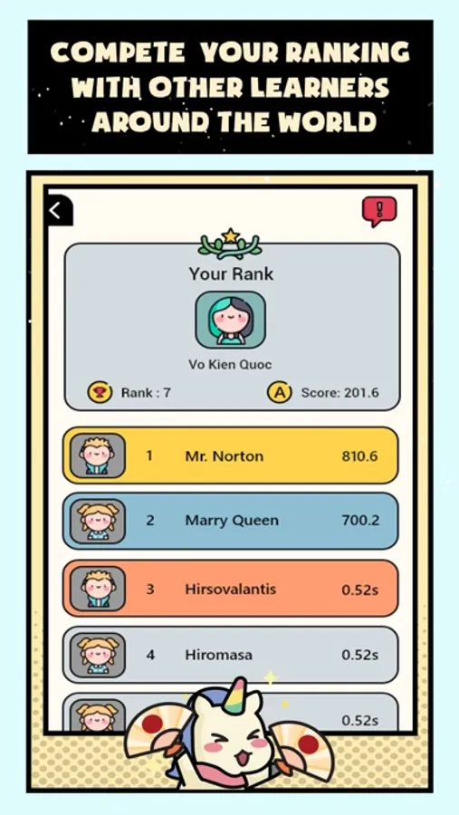 Challenge multiple choice questions within the time-limit. Results come out as a ranking among all learners around the world.