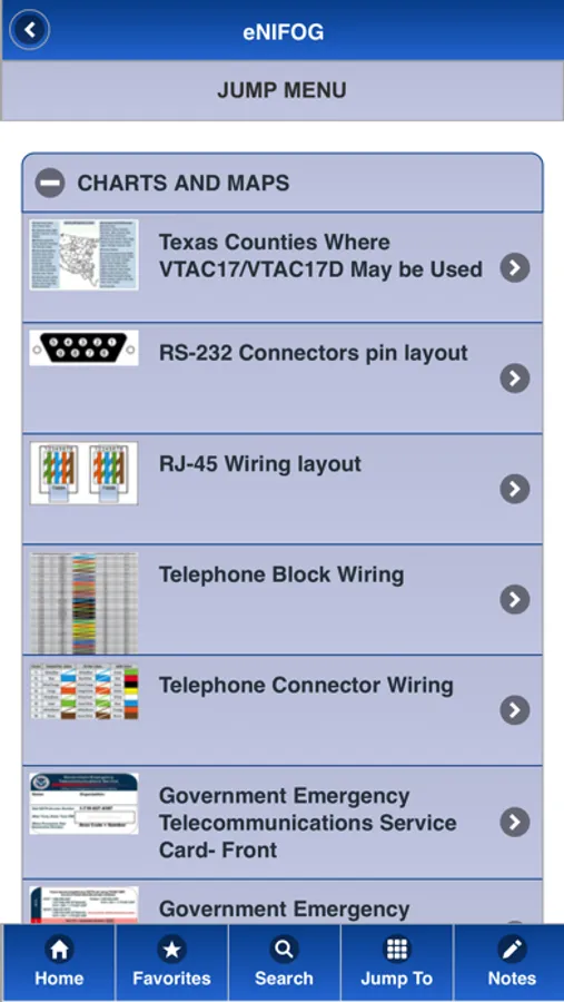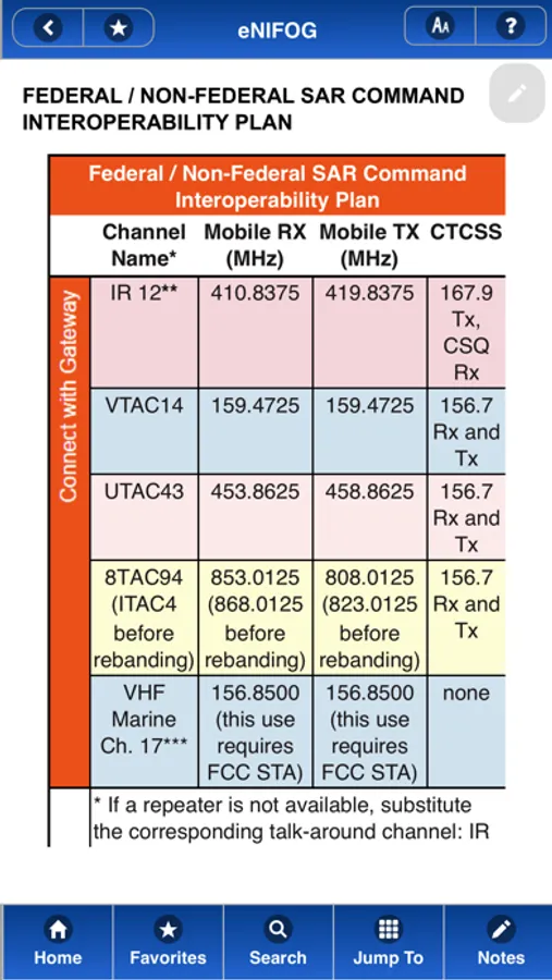 eNIFOG app is an electronic reference of the National Interoperability Field Operations Guide (NIFOG). The NIFOG is a technical reference for emergency communications planning and for radio technicians responsible for radios that will be used in disaster response. It includes rules and regulations for use of nationwide and other interoperability channels, tables of frequencies and standard channel names, and other reference material.