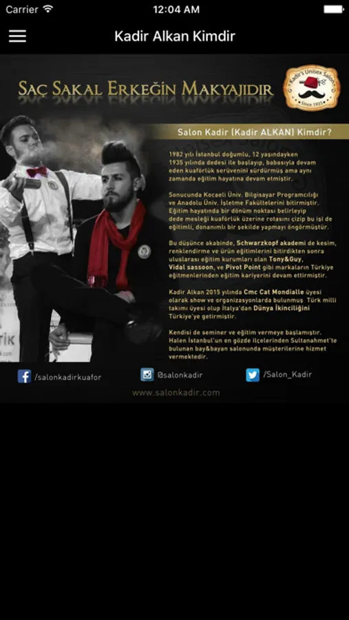 Kadir Alkan Hair Artist Salonlarında Kadir Alkan’a online randevu alabileceğiniz şeffaf bir platform oluşturduk. İçerik bakımından Türkiye’de ilk olarak hem bilgilendirme hem randevu alma hem de hatırlatma özelliği olan ilk kuaför uygulaması olma özelliği taşımaktadır