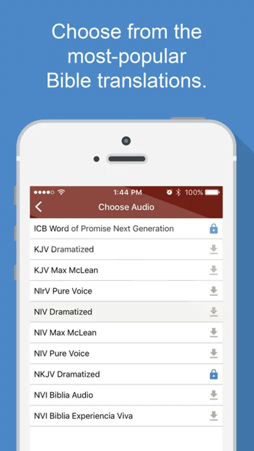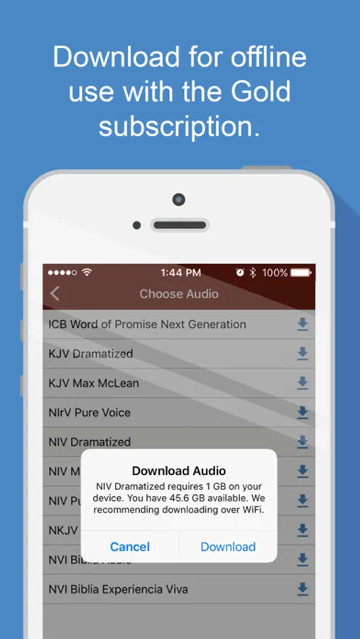 • With the Gold subscription, you can download your favorite translations to listen without data plan limits. Anytime. Anywhere.