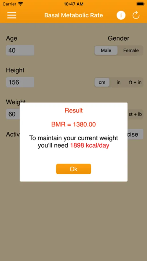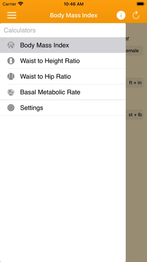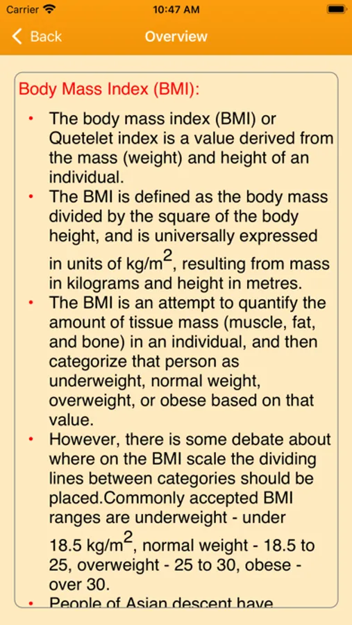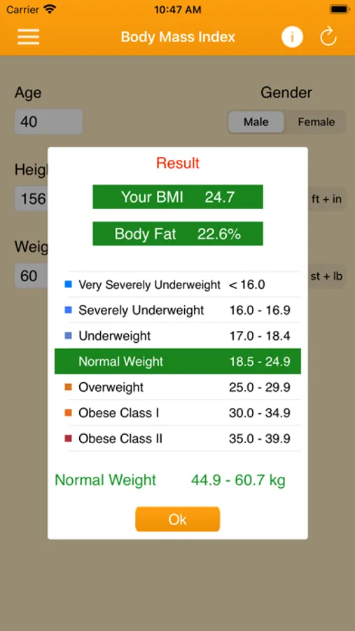 The BMI calculation is done in metric units, Imperial or US Standard units. Users can personalize this app by changing background color, gender, font style name and units in settings page.