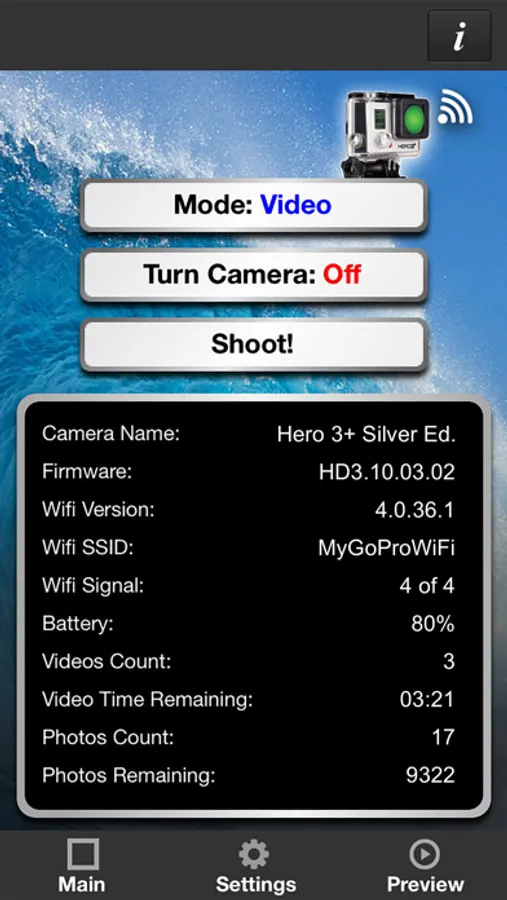 Control your GoPro Hero 3+ Silver remotely. Features included video resolution, frame rate, field of view, light level, photo resolution, continuous rate, burst rate, orientation, spot meter, video + photo, looping video, LED and video type.