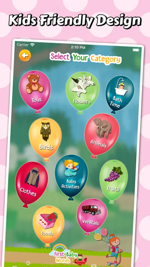 - There are 10 baby flashcard categories and more than 100 words(Animals, Birds, Baby Activities, Bathtime, Clothes, Flowers, Food, Fruits, vehicles and Toys).