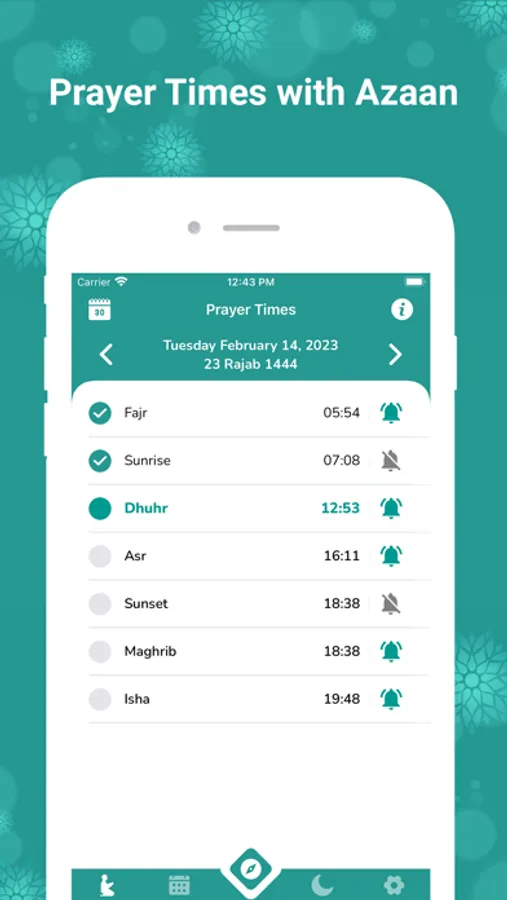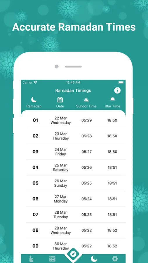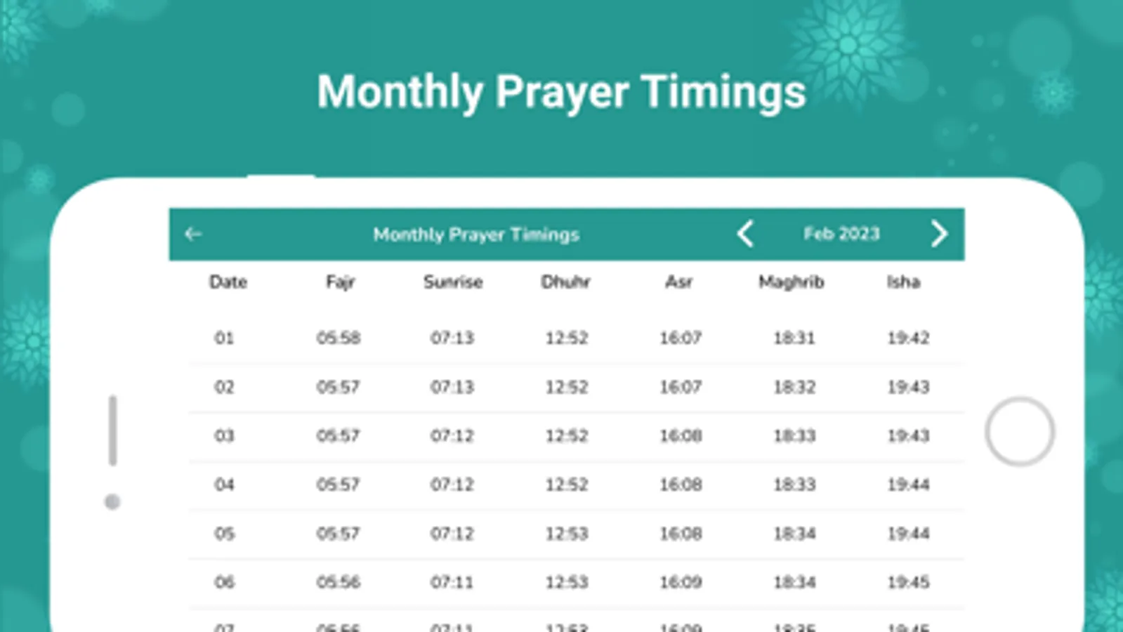 - Monthly Prayer Times shows the entire month’s prayer times in the app.