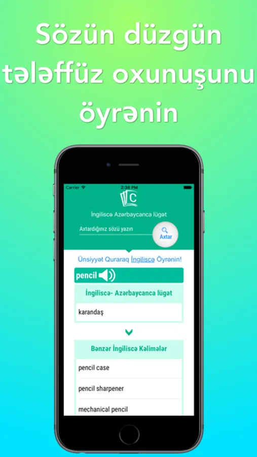 Sözlərin İngiliscə Azərbaycanca mənalarını, tərcümələrini bu lüğət ilə öyrənə bilərsiniz. Eyni zamanda hər sözün necə oxunduğunu, İngiliscə tələffüzünü asanlıqla dinləyib öyrənə bilərsiniz.