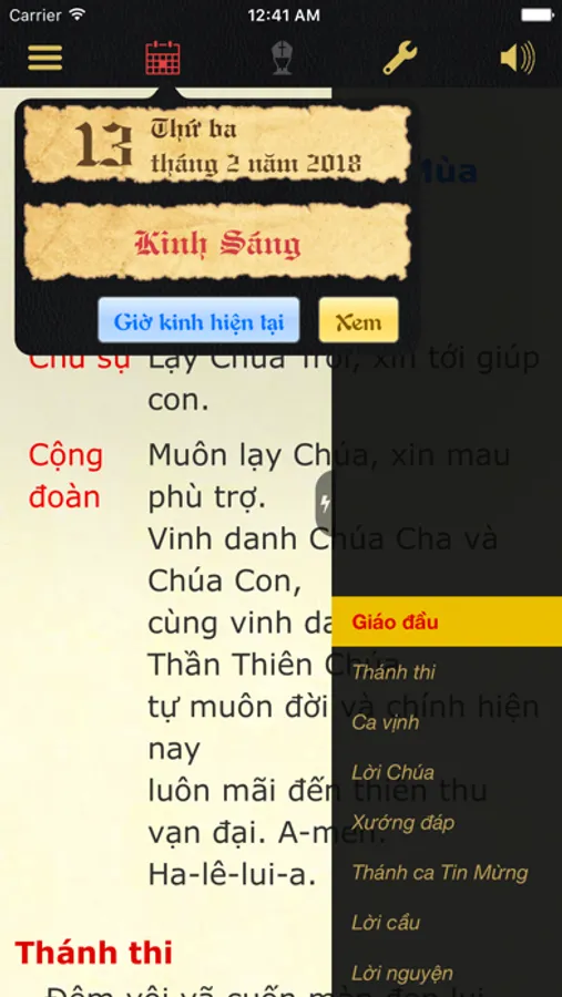 - Kinh Phụng Vụ và Bài Đọc tự động thay đổi theo ngày giờ đúng với lịch Công Giáo.