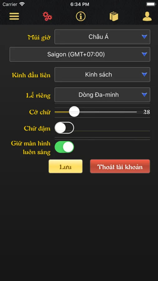 - Hỗ trợ điều chỉnh và lưu lại các cài đặt như: kinh đầu tiên trong ngày, múi giờ, cỡ chữ, chữ đậm hay nhạt.