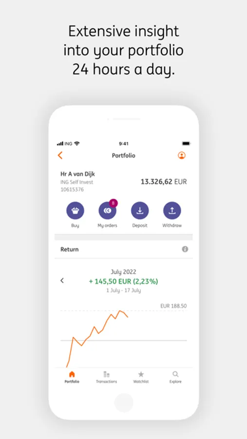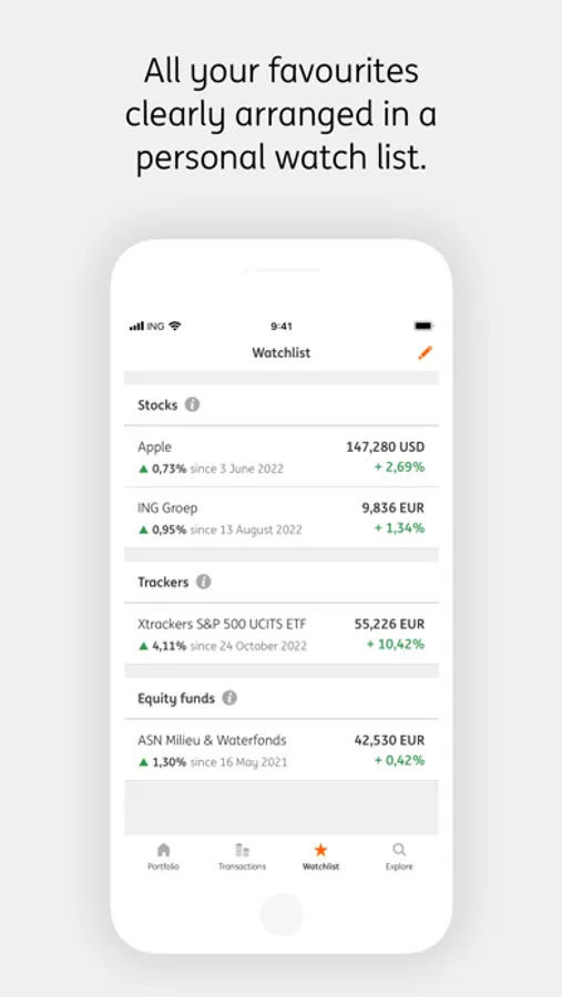 With ING Investments you manage your investments via a secure connection. No personal information will be stored on your phone. Just make sure you always use the latest version of the app. This way the app meets the current safety standards and offers the latest features.