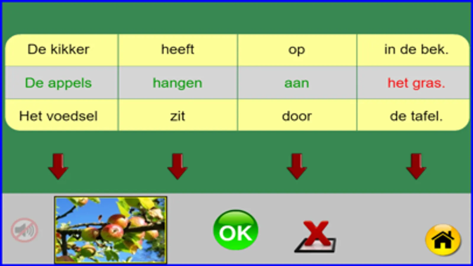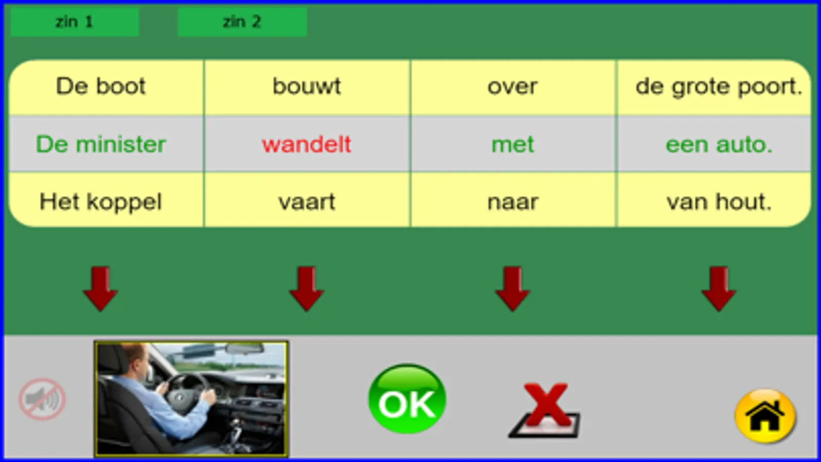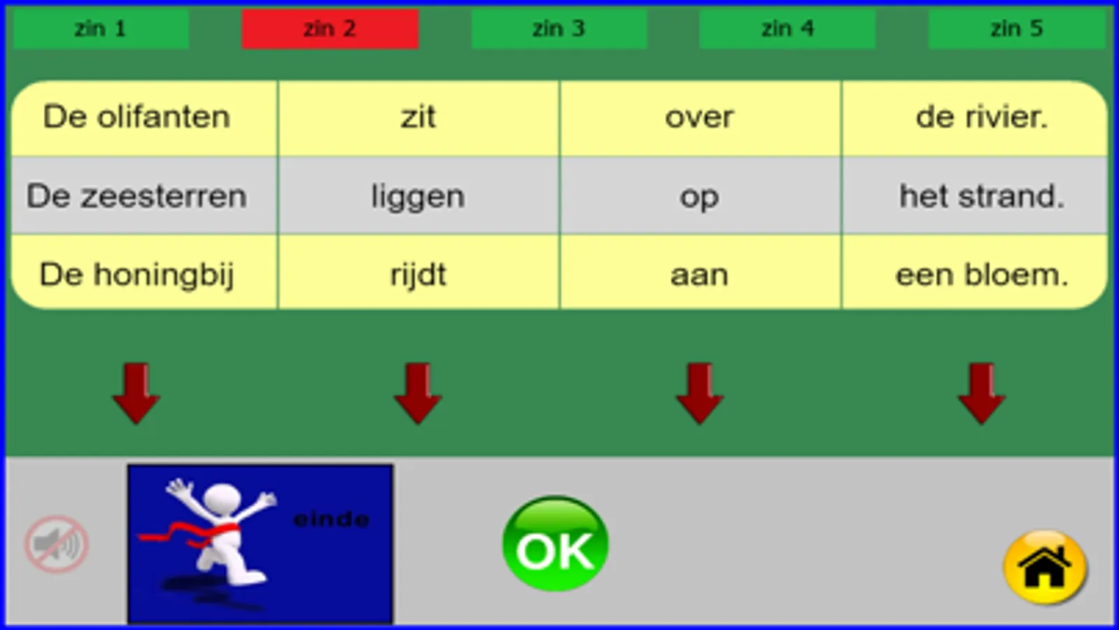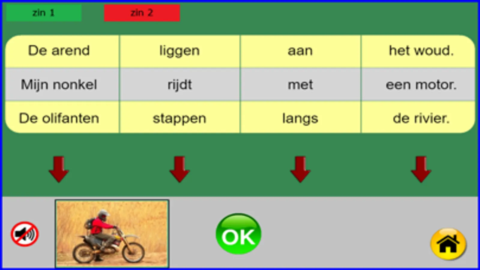 Deze oefening is gemaakt voor leerlingen van het 1ste leerjaar, groep 3 of anderstaligen. Er zijn 40 reeksen van elk 5 zinnen, dus 200 zinnen. Elke zin heeft 4 zinsdelen die bij elkaar moeten passen en overeenstemmen bij een getoonde afbeelding. Zinsdelen die juist zijn worden groen, de foute zinsdelen worden rood. Indien er meerdere oplossingen zijn moet men blijven zoeken naar de door het programma gekozen oplossing. Na elke gemaakte oefening (ongeacht het resultaat) kan er een klein spel gespeeld worden (doolhof). Deze oefeningen kunnen vrij gemakkelijk gemaakt worden vanaf AVI-M3 of AVI-E3. Ik heb deze oefeningen gemaakt steunend op mijn 25-jarige ervaring in een 1ste leerjaar (groep 3). Billiau Danny.