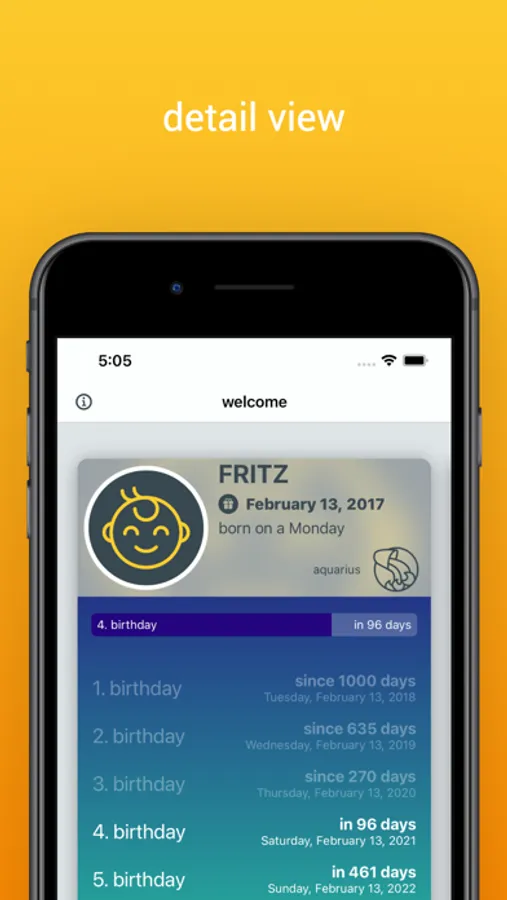 To calculate the exact age, was hard for us, so we decided to create this small app. Setup your baby birthday and the app tells you the exact age in a second.