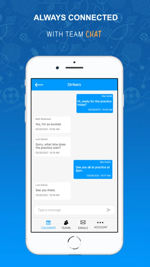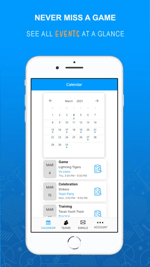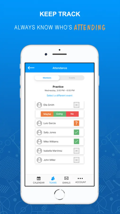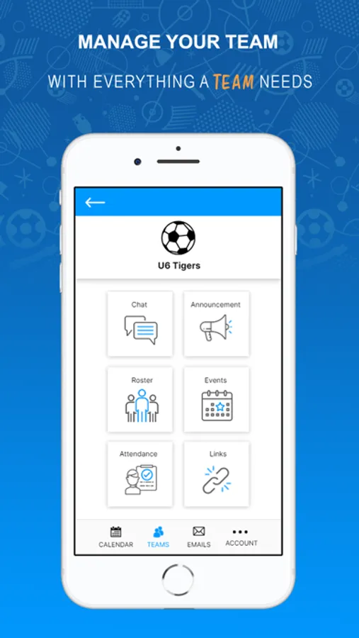 For each team, you can manage your events, roster, and attendance. You can also view announcements, links, downloads, and send a team or staff communication.