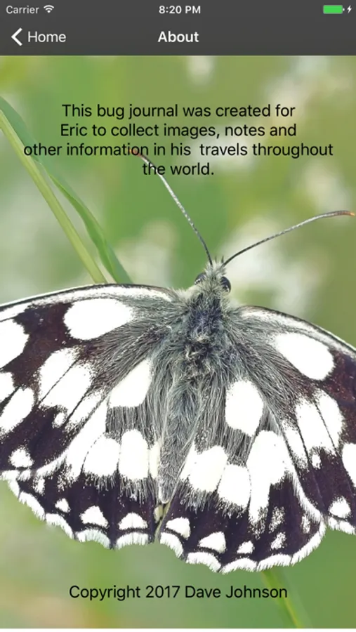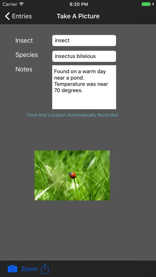 Bug Journal is a virtual bug collection. You will be able to take pictures and record field notes. Date and location are automatically stored with the photo. Sort the journal by date, name or species.
