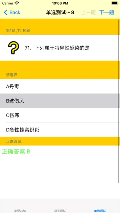 4、随机测试:随机生成100道试题随机测试,检验复习成果,可自动将错题加入到错题库。