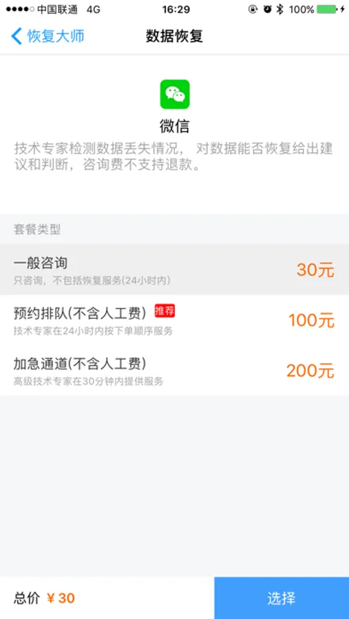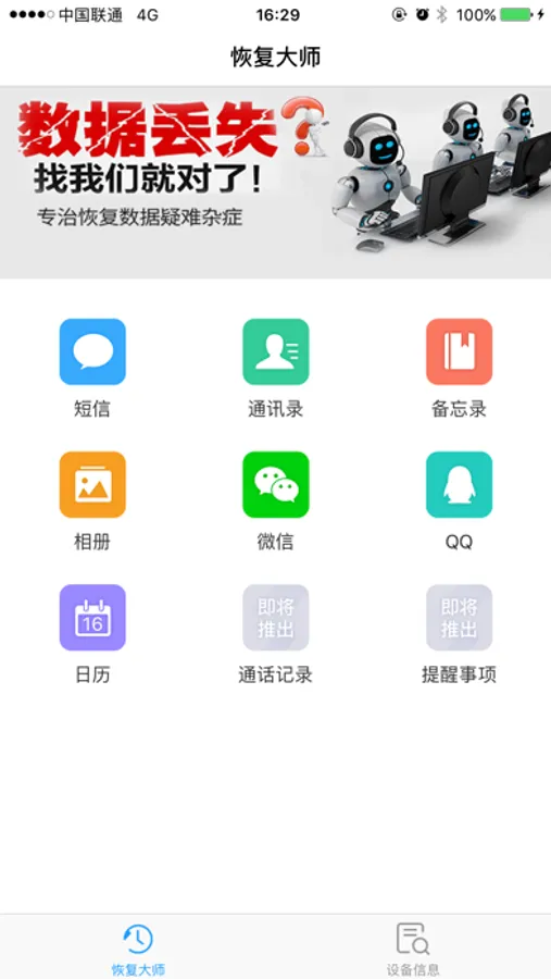 支持微信聊天记录,QQ聊天记录,照片或视频,手机短信,手机通讯录,备忘录信息等的数据恢复。