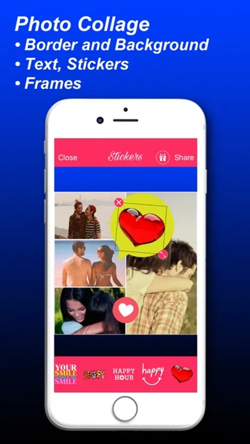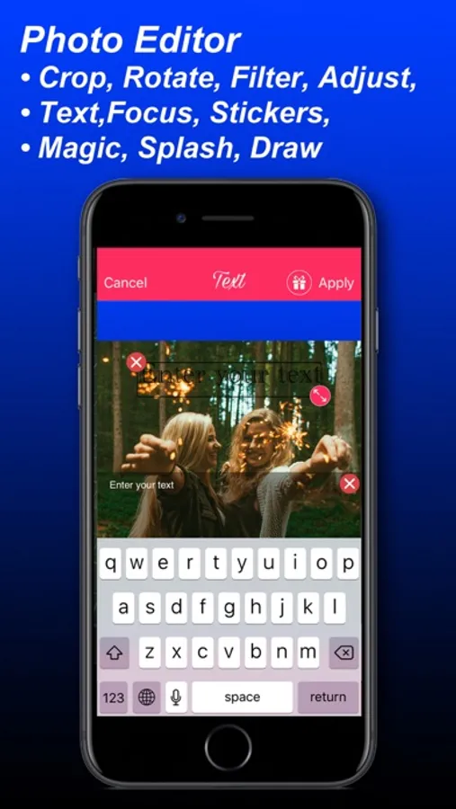 - Crop,Rotate, Filter, Adjust, Text, Focus, Stickers, Magic, Splash, Draw