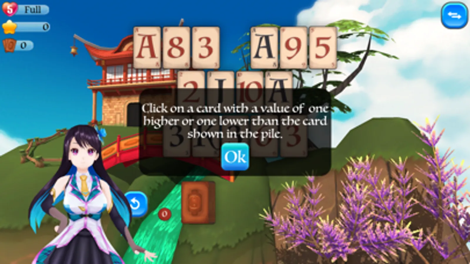 The card game consists in clearing the board by taking a card that is one above or below than the card on the deck.