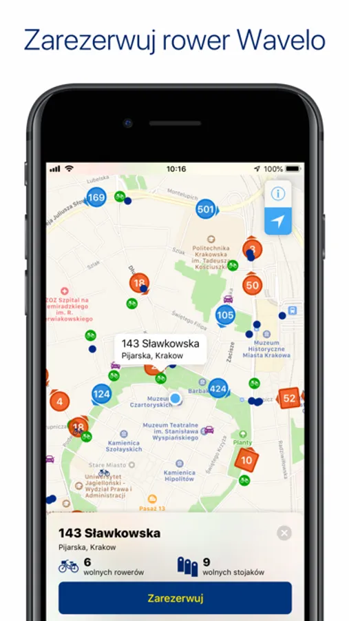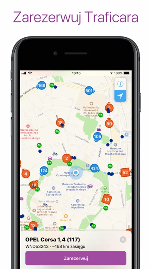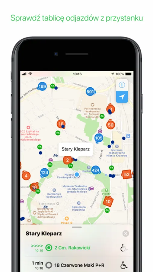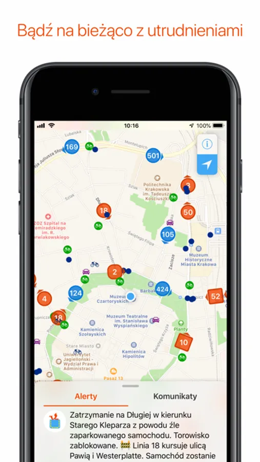 This app will help you travel around Cracow! The map shows your current location along with live positions of trams and buses. You can look into every vehicle's and stop's timetables. We plan to add shared bikes and cars locations in the near future.