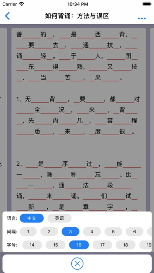 此App中的背诵记忆方法借鉴了英语考试中的完形填空,挖空一部分文字再进行背诵记忆,在补全心理(完形填空题型的基础理论)下,记忆者的专注度得到了极大的提高,绞尽脑汁根据上下文填空,这种情况下挖空的文字被记住的可能性就越高。