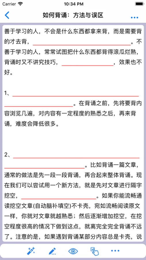 对于需要背诵记忆的大段知识,需要非常熟悉并且能够完整复述出来,极大地考验学习者对文章段落的熟悉度。挖空记忆可以帮助实现渐近式背诵记忆过程,降低初期记忆难度,同时也方便使用者自我考查对文章熟悉度。度过初期阶段后就可以对难点部分进行挖空重点记忆,最终达到完全记忆的目的。
