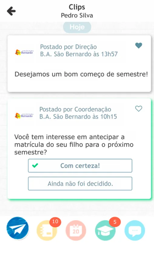 Através desse aplicativo os PAIS encaminham recados à professora, a coordenação ou a secretaria do colégio além de confirmarem a presença em eventos e autorizarem a saída do aluno com terceiros ou a passeios escolares.