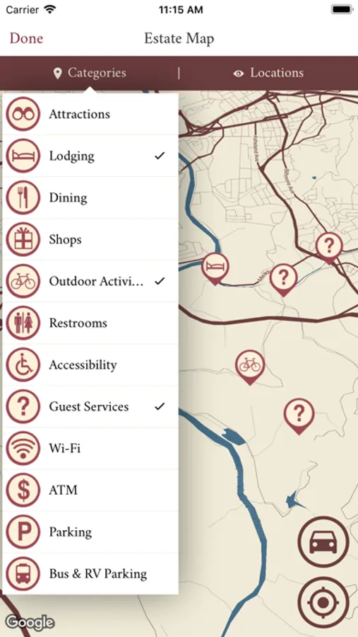 - Use the interactive, GPS-enabled map to locate points of interest across the estate, as well as restaurants, shops, and restrooms.