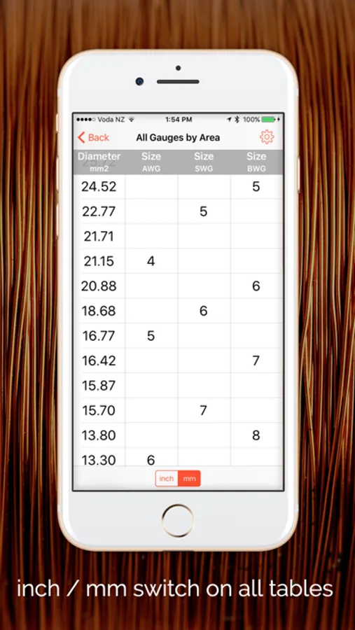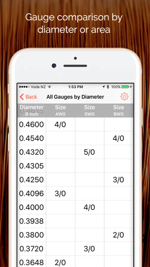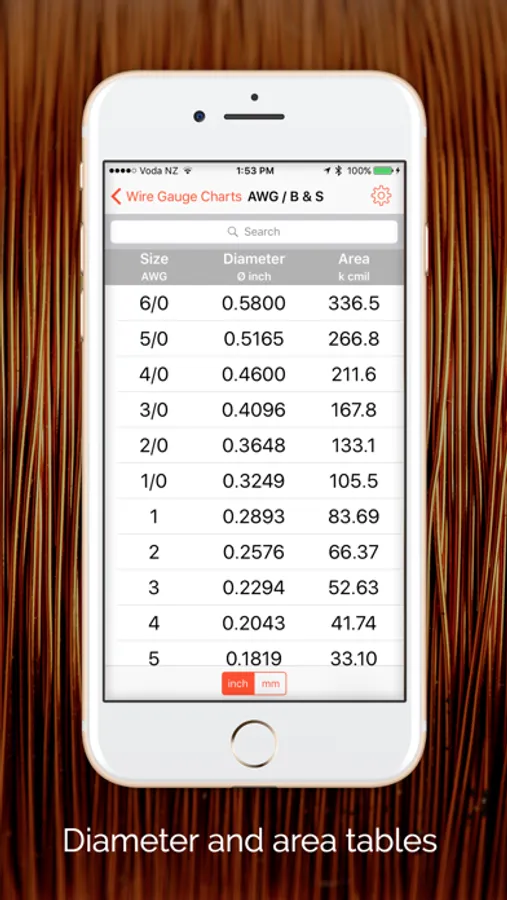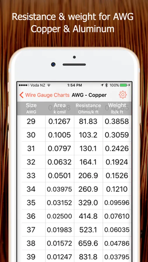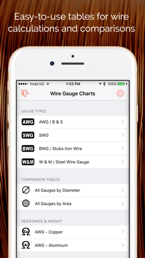 An easy-to-use set of charts giving diameter, area, resistance,and weight values of various wire gauge types. No typing required, just tap the required gauge type, and scroll through the chart to find your wire gauge.