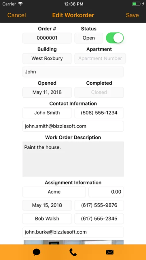 The workorder manager function keeps track of repairs that need to be made to buildings and/or apartments. Take pictures of the work or repair and attach it to the workorder Assign contracts to individual workorders and Call, text or email your maintenance contractors directly from the app. Keep track of which workorder is open and how much the repair cost.