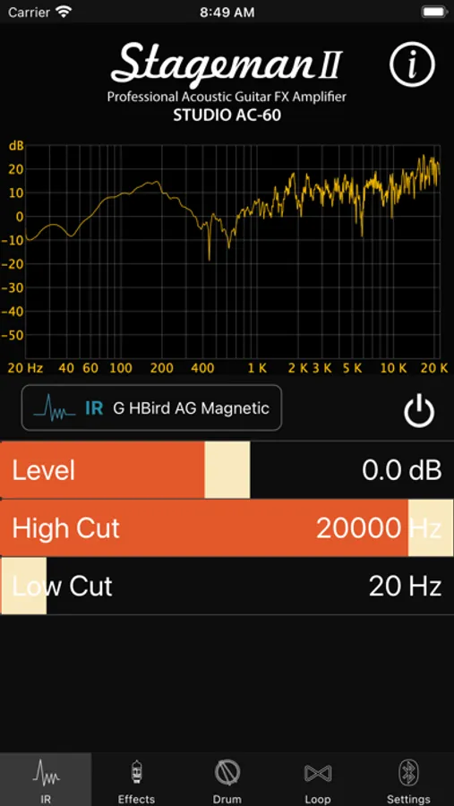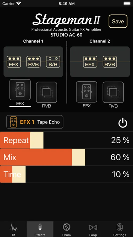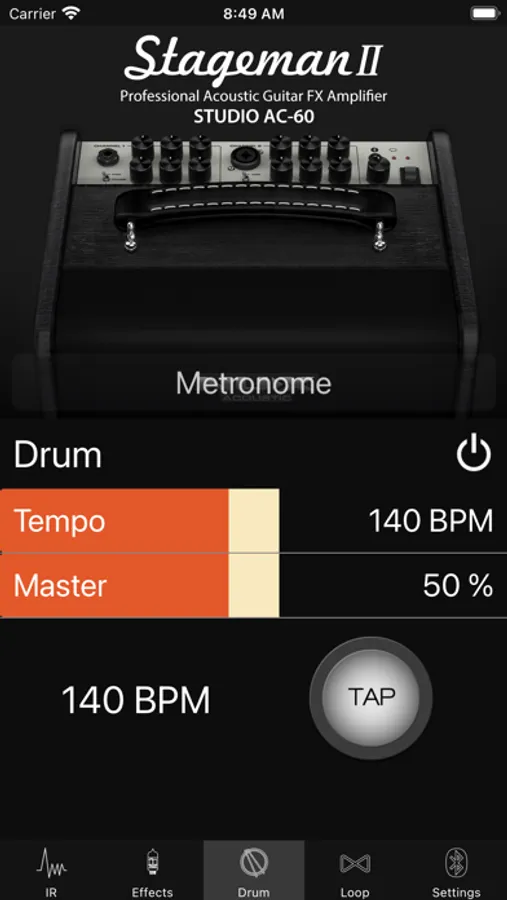 This APP allows user to use built-in drum patterns and looper function of stageman acoustic amplifier with bluetooth. User also can control the effect parameters of the amplifier, such as rate and depth of chorus and reverb. Each channel has individual effects can be controlled by APP, Channel 1 for acoustic guitar and Channel 2 for vocal. A total of 20 drum patterns and 60 seconds looper can be used simultaneously.