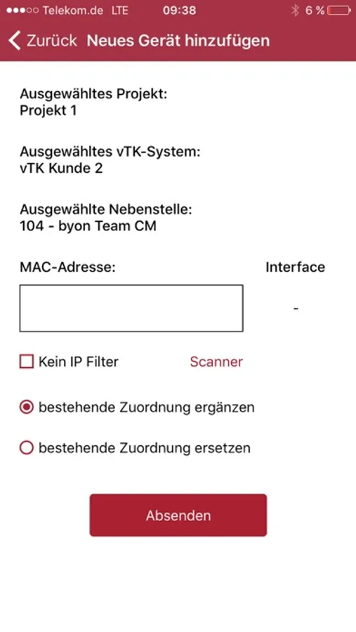Mit der byon vTK.connect App lassen sich Telefon-Endgeräte unkompliziert an der Cloud Telefonanlage byon vTK registrieren. Die einzurichtende Telefonanlage des Kunden wird in der App freigeschaltet. Danach genügt es, die MAC-Adresse des Telefons mit dem Barcode-Scanner einzulesen und dem entsprechenden Nutzer zuzuweisen. Weiterhin lassen sich nachträglich Zuweisungen ändern oder Nebenstellen mehrere Endgeräte zuordnen. Durch die vTK.connect App reduziert sich der Aufwand der Einrichtung deutlich und kann bequem per Smartphone ausgeführt werden.