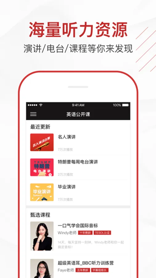 - 海量资源,包含公开课,名人演讲,毕业演讲,美国经典英文演讲等海量音频视频资源,定期更新,增强学习趣味性!