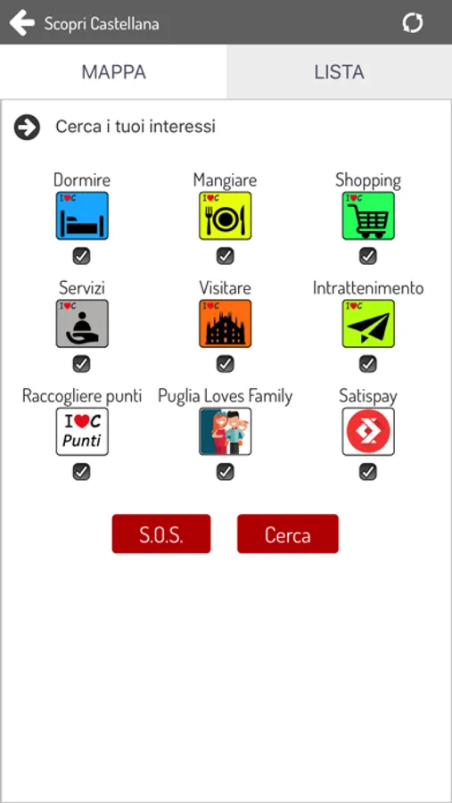 I LOVE CASTELLANA ha anche un esclusivo pulsante SOS per essere informati sulla geolocalizzazione di tutti i defibrillatori pubblici, le farmacie e parafarmacie, le stazioni di pubblica sicurezza ( polizia stradale, polizia municipale e carabinieri) il punto di primo intervento territoriale, l'ospedale ecc.