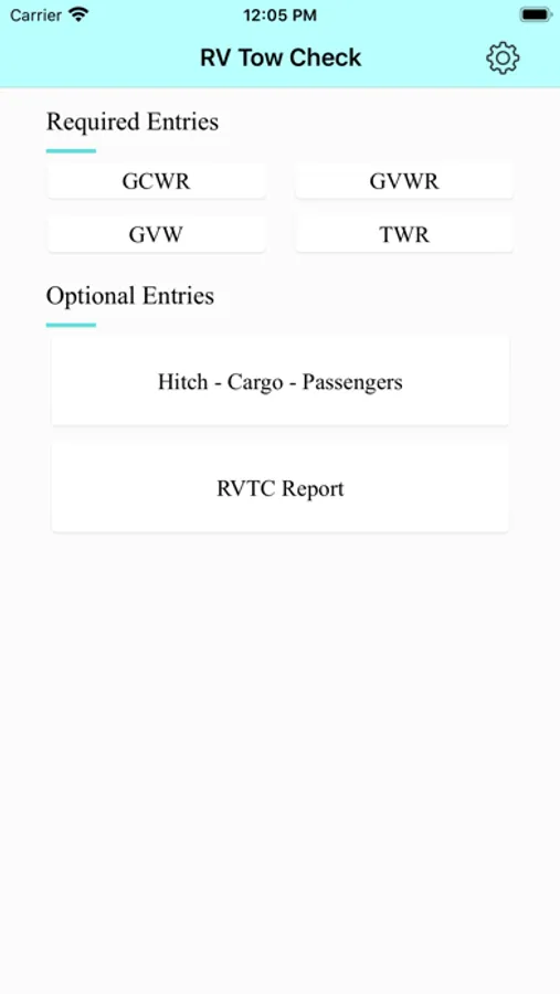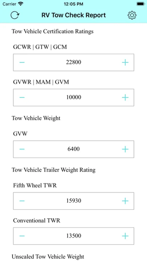 RV Tow Check requires four weight inputs from the tow vehicle. The required entries are gross combination weight rating (GCWR), gross vehicle weight rating (GVWR), gross vehicle weight (GVW), and trailer weight ratings (TWR).