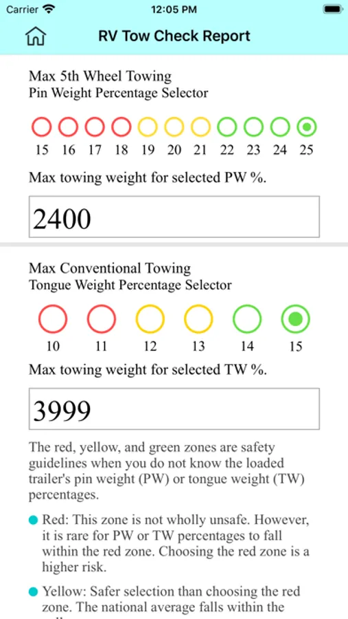 RV Tow Check provides instant max towing capacity results as the user selects various kingpin or tongue weight percentages.