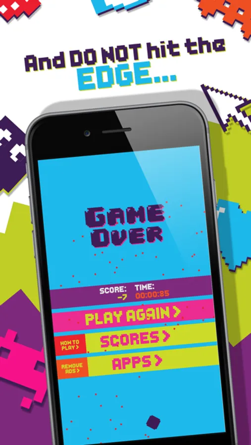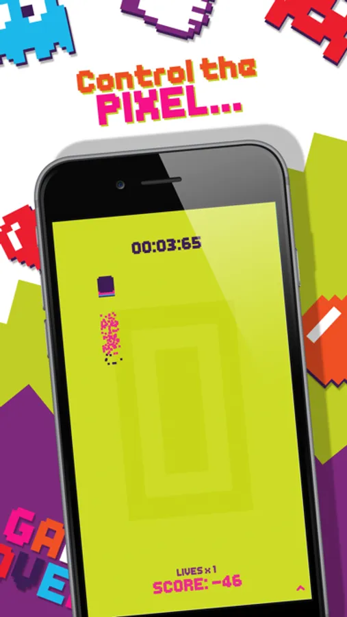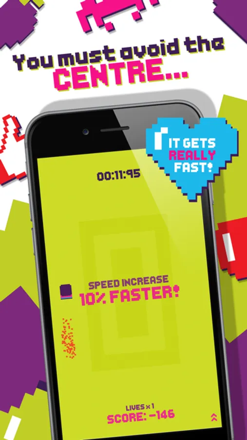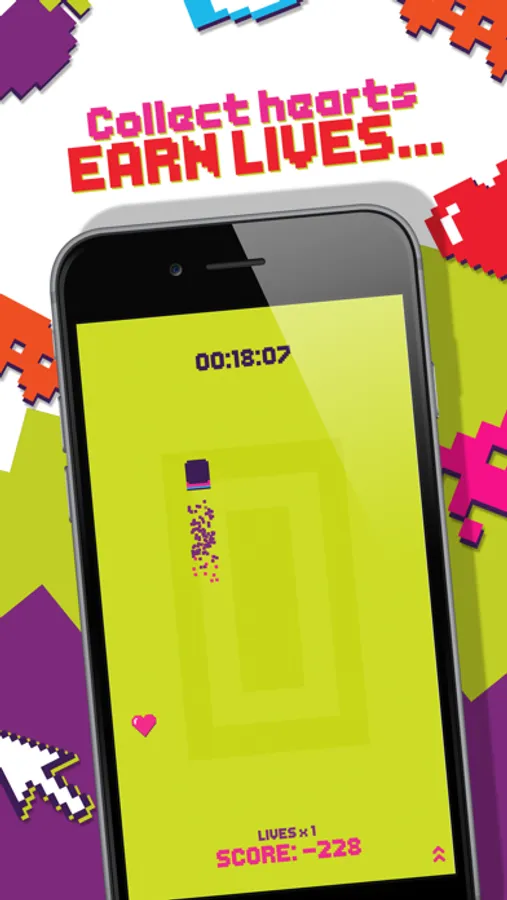 It's simple, tap to control the pixel on the screen, avoid the centre or you'll see your points deducted and speed decrease. Make sure you don't let the pixel hit the edge or it's game over! Collect as many hearts along the way, you'll be able to pass through the edge if you have more than 1 heart extending your gameplay! Beware your pixel 'dash' will gain speed every 10 seconds.
