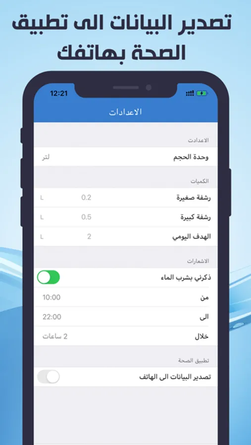 يقوم بالتطبيق باستخدام خدمات الصحة المتوفرة في النظام عبر توفير بيانات الشرب التي تقوم بادخالها الى النظام ويمكن رؤيتها في تطبيق الصحة الموجود بالجهاز مسبقاً. يمكنك تفعيل او تعطيل هذه الخاصية في الاعدادات داخل التطبيق.