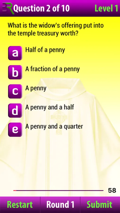 To have access to over 800 questions, upgrade to 3R Bible Quiz Deluxe. This app includes Easy, Intermediate, and Advanced levels.
