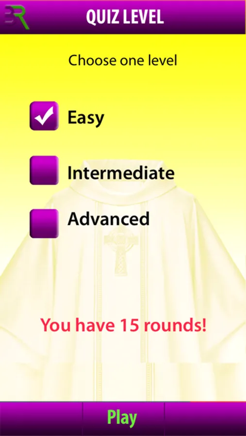 In the Easy and Intermediate versions, users are restricted to the Easy and Intermediate levels respectively. To upgrade to the Deluxe version that includes Easy, Intermediate, and Advanced level, tap on " Upgrade to 3R Bible Quiz Deluxe " at the end of each round or when you have submitted your score.