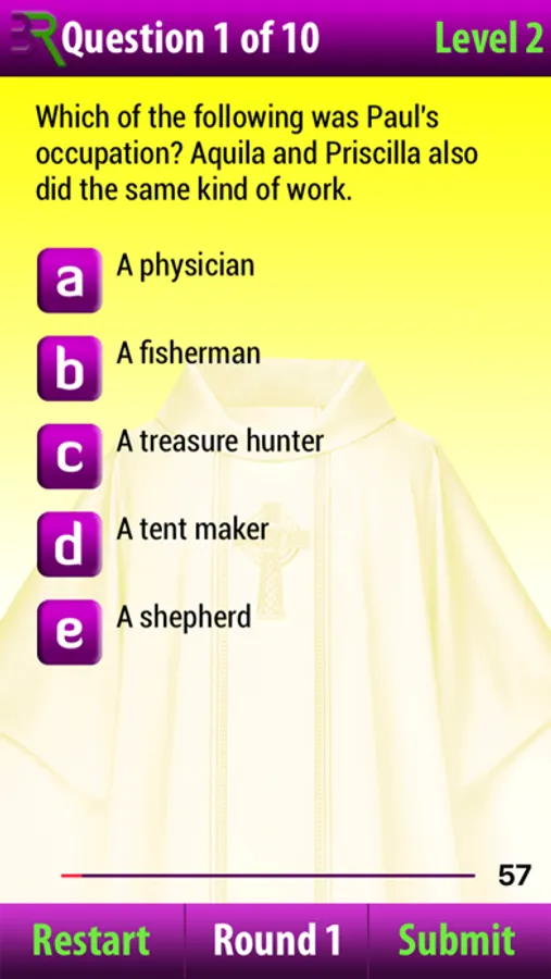 Choose one answer and follow the on-screen instruction. The wrong answer(s) will be highlighted in red colour and the location in the bible where users can verify the correct choice will also be displayed and underlined. You have 60 seconds to answer each question. If you do not answer a question before time expires, the app will load the next question. At the end of each round of ten questions, your score, in percentage, will be displayed. Enjoy!