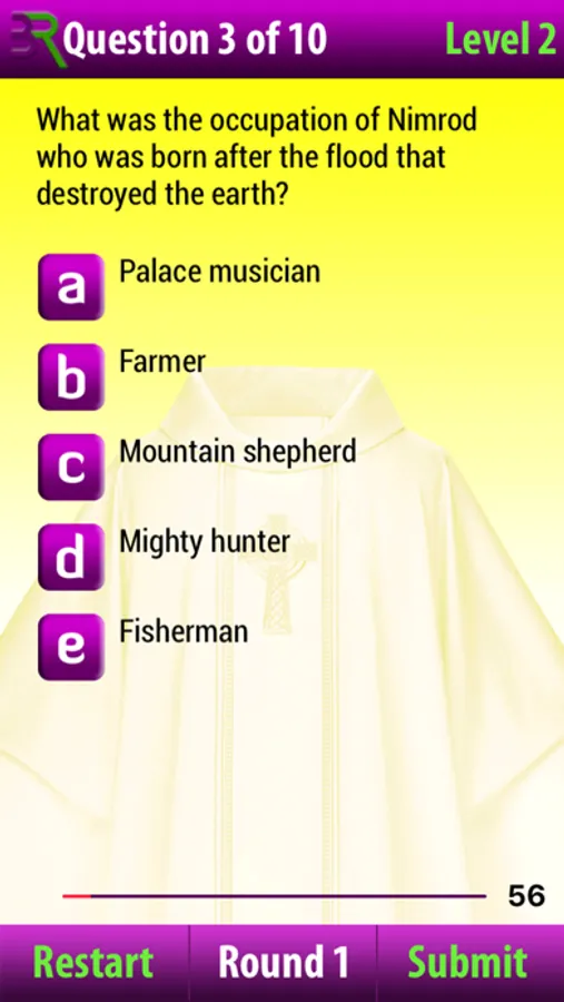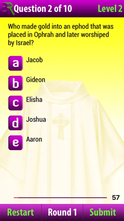 To have access to over 800 questions, upgrade to 3R Bible Quiz Deluxe. This app includes Easy, Intermediate, and Advanced levels.
