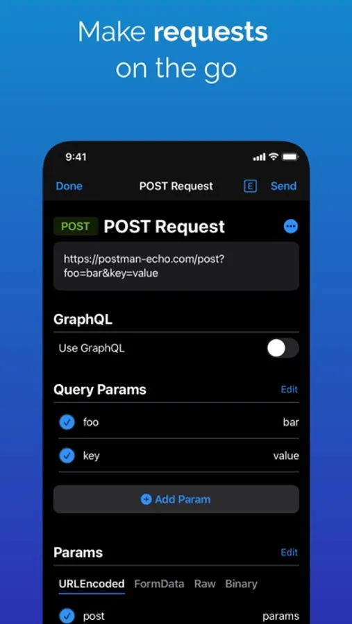 - Native support for GraphQL requests - edit queries and variables directly, without having to go through the post body.