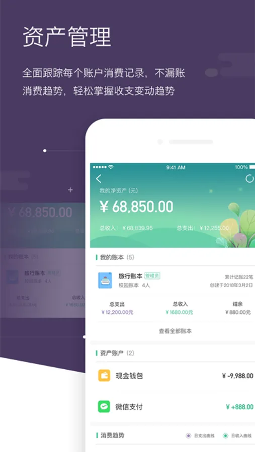 囊括现金、微信钱包、支付宝、信用卡、储蓄卡等最前沿的资产账户。