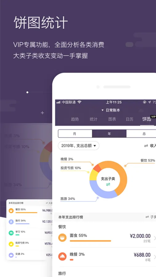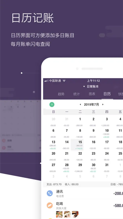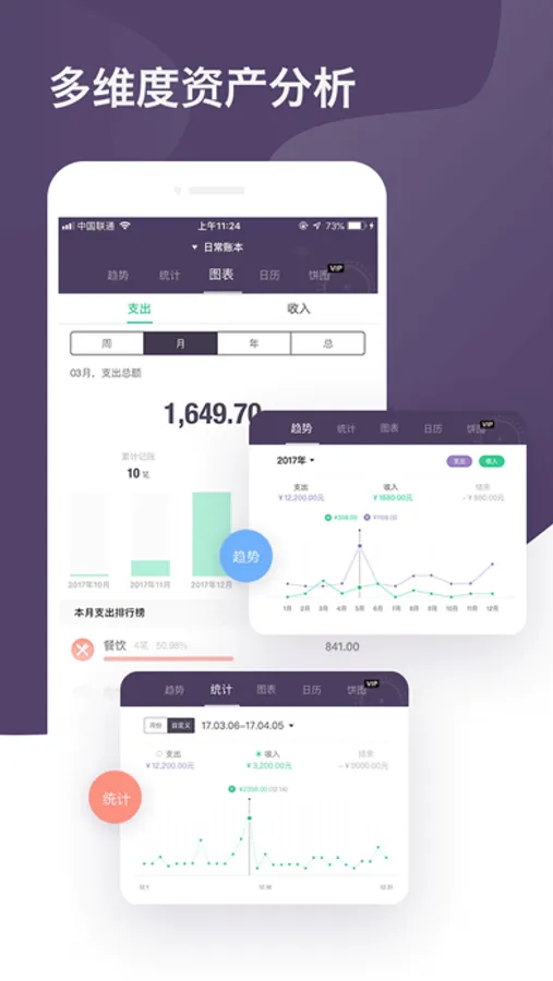 年度趋势、月度分析、日历等可视化的数据展示,让您的账单一目了然!