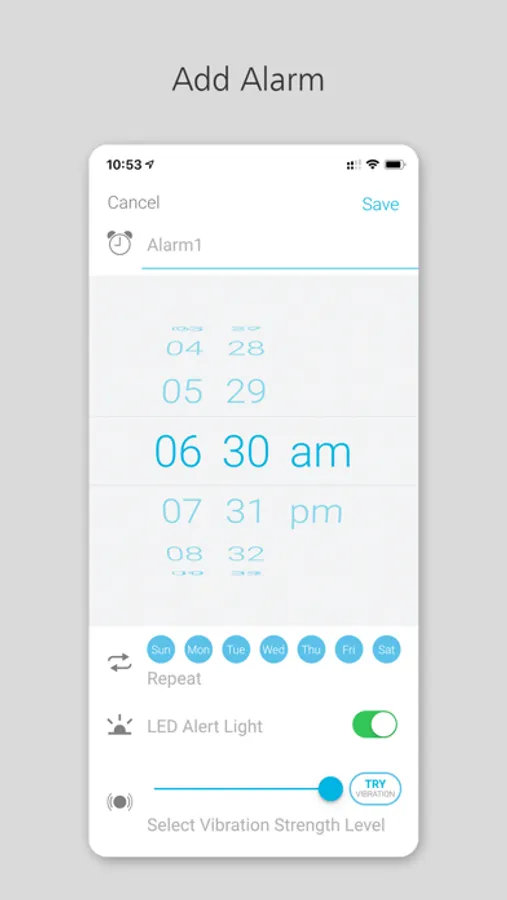 Customize how you wake up by selecting the various different alarm features; vibration, LED or vibration and LED.