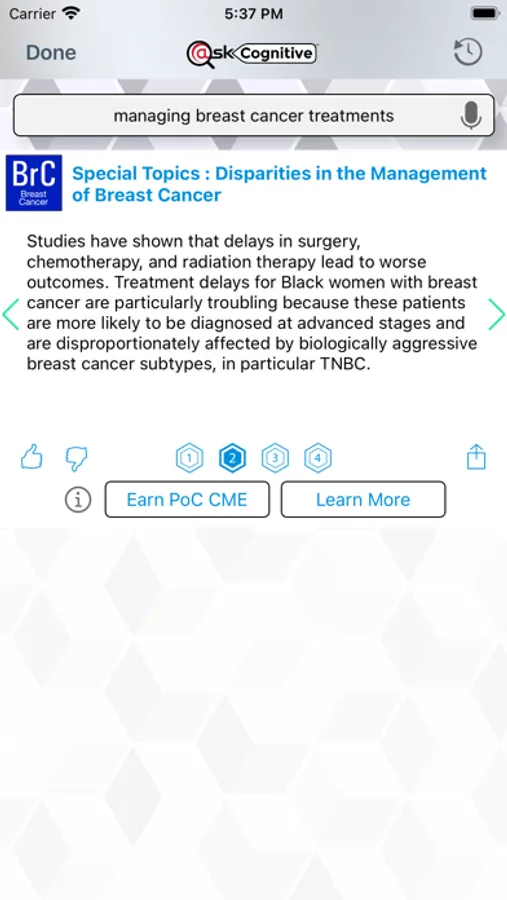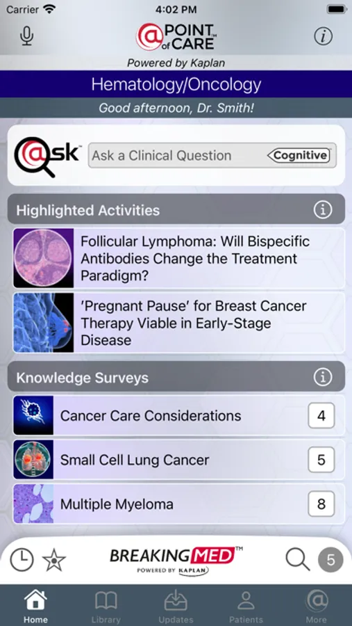 Featuring @sk Cognitive AI, clinicians use Hematology/Oncology @Point of Care to easily access curated, evidence-based, and disease-specific medical content. Clinicians navigate content by asking voice-enabled natural language questions. The @sk Cognitive, confidence-rated answers happen more quickly to efficiently incorporate best treatment options and decisions are made faster to improve patient outcomes at the point of care.