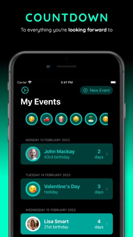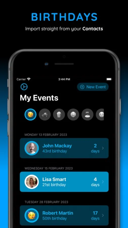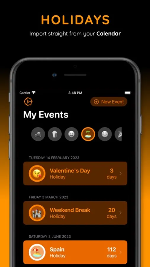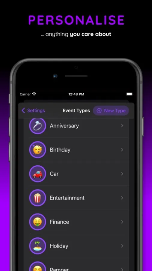 You can create your own event types and you can customise all of your events with photos and emoji. You can also create secret events which will only be displayed when you authenticate. Events can be configured to repeat and to send you reminders. You can also quickly import birthdays from your contacts and events from your calendar. Talking of birthdays, you can add checklists to your events - perfect for keeping track of gifts. Never forget an event again!