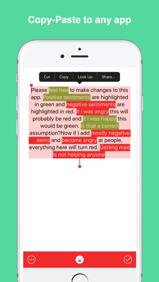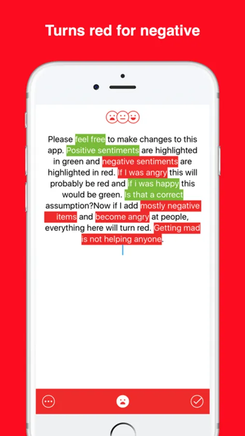 Ever sent a text or an email and wondered if you sounded negative? Sent-iment is an app that helps you analyze the sentiment of any text. Simply type your text or copy from any location and paste it to the app and the app will highlight negative and positive text segments and give you a simple Green or Red indication for overall sentiment of the text. See what the powerful sentiment analysis app can do for you.
